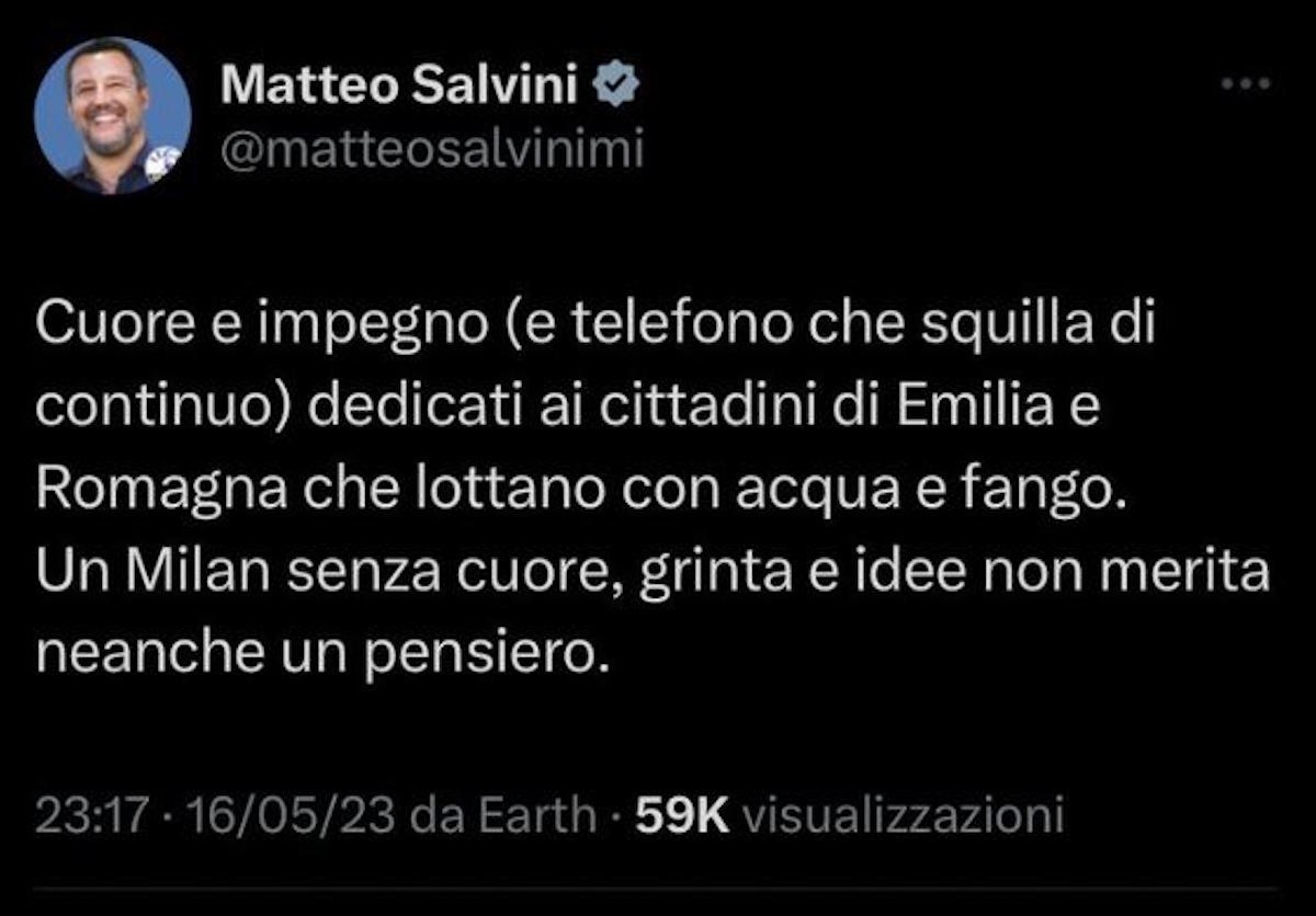 Salvini, che gaffe! Il Milan e l'alluvione in Emilia sullo stesso piano