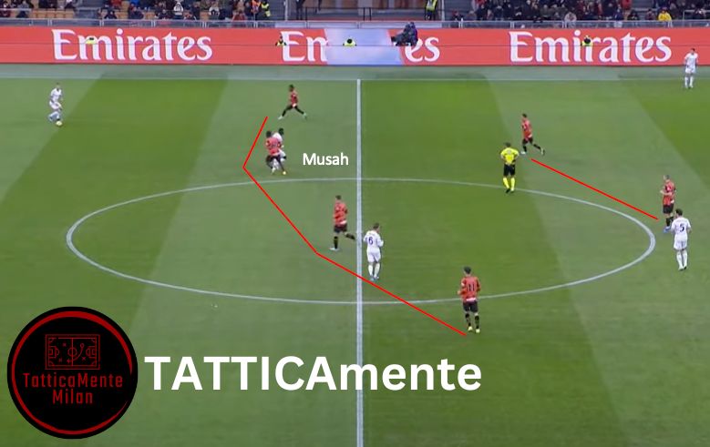 Se nelle passate partite il Milan ha sempre difeso organizzandosi in una sorta di 4-2-3-1 (con Reijnders come centrocampista più avanzato in pressione), contro i viola era più che altro Musah ad alzarsi in pressione andando addirittura ad affiancare Jovic. In questo modo, lo schieramento difensivo assumeva più le sembianze di un 4-2-4. Così facendo era possibile coprire, con Musah e Jovic stessi, le linee di passaggio su entrambi i registi viola: Duncan e Arthur. I due mediani rossoneri (Reijnders e Pobega), allo stesso tempo, hanno adottato una marcatura. più a zona, creando una gabbia attorno a Bonaventura ed, eventualmente, andando in copertura anche sugli esterni d’attacco viola.