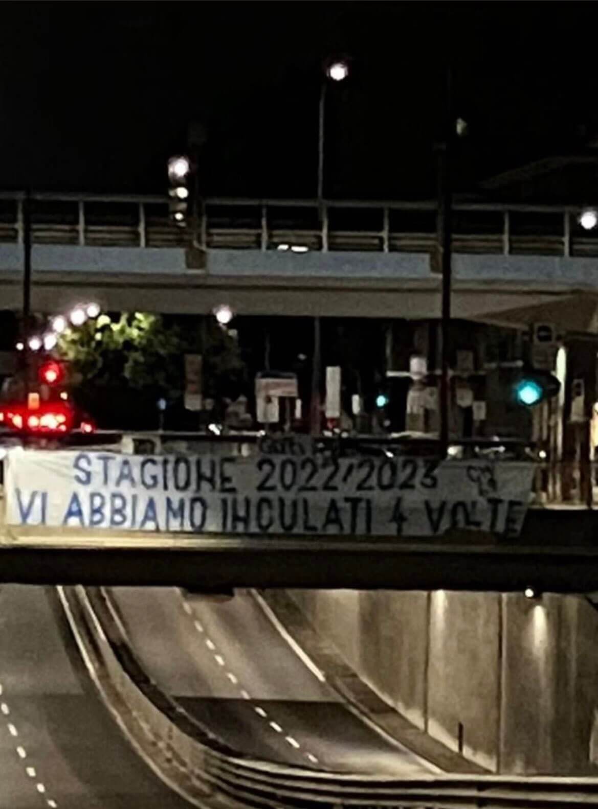 Altri striscioni firmati Curva Nord ricordano ai milanisti la superiorità dell’Inter nei derby della stagione: “Vi abbiamo inculxxi 4 volte” recita un messaggio. Uno sottolinea quanto Calabria e compagni nel derby di andata del 15 maggio siano durato “meno di una sveltina”. Dopo appena undici minuti, infatti, l’Inter era già in vantaggio 2-0 grazie ai gol di Dzeko e Mkhitaryan.