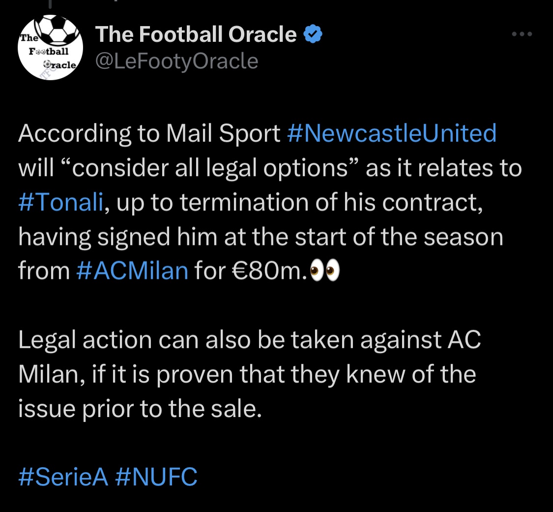 Il Newcastle, riporta il profilo Twitter “The Football Oracle”, si starebbe muovendo per capire se il Milan fosse a conoscenza della ludopatia di Tonali. Prima della cessione del cartellino del giocatore, avvenuta la scorsa estate. Come già riportato dalla nostra redazione, da fonti italiane trapela però che la Società non fosse a conoscenza della problematica di Tonali. Elemento confermato anche dal quotidiano La Repubblica.