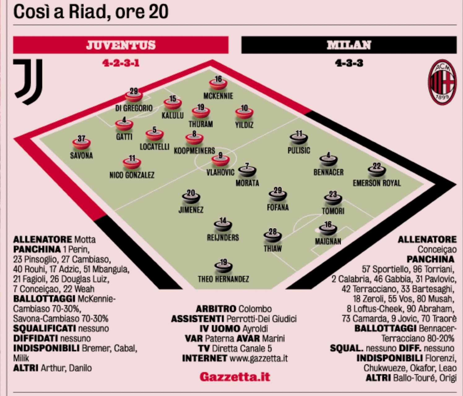 Supercoppa Italiana Juventus-Milan, Sergio Conceicao sconfessa subito Paulo Fonseca. Le scelte (fonte immagine La Gazzetta dello Sport)