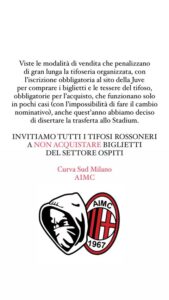 Viste le modalità di vendita che penalizzano di gran lunga la tifoseria organizzata, con l’iscrizione obbligatoria al sito della Juve per compare i biglietti e le tessere del tifoso, obbligatorie per l’acquisto, che funzionano solo in pochi casi (con l’impossibilità di fare il cambio nominativo), anche quest’anno abbiamo deciso di disertare la trasferta allo Stadium. Invitiamo tutti i tifosi rossoneri a non acquistare biglietti del settore ospiti.